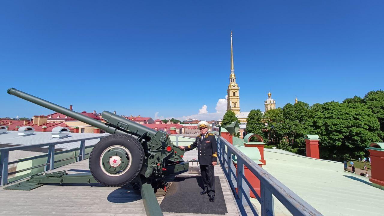 Контр-адмирал Анатолий Васильевич Гаврилов произвел полуденный выстрел с Нарышкина бастиона Петропавловской крепости в честь 78-й годовщины прорыва морской минной блокады Ленинграда.
