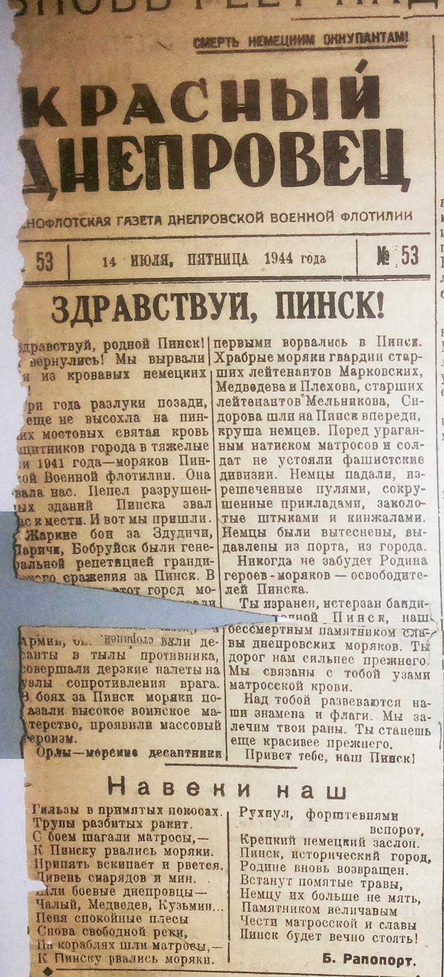 На берегу реки в Пинске у братской могилы погибших при освобождении города 176 моряков, бойцов 61-й армии и партизан установлен памятник героям десанта
