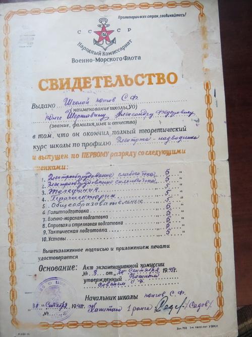 Через восемь месяцев я окончил Соловецкую школу юнг и нас распределили по всем флотам. До сих пор храню свидетельство об окончании Школы, в котором по всем предметам — и специальным, и общеобразовательным — стоит отметка «отлично». Служили мы на кораблях наравне с матросами, и моряки нас всегда принимали за своих. Я попал в спецкоманду, которая принимала немецкие корабли, побывал в Кёнигсберге. Некоторые попали в Белоруссию на Днепровскую флотилию, участвовали наши юнги и в освобождении страны. Так, юнга Виль Кравченко погиб смертью храбрых в бою за освобождение Мозырщины на реке Припять. Памятник из черного гранита отважному парню вечно будет стоять на берегу белорусской реки, напоминая всем о подвиге юных защитников Родины.