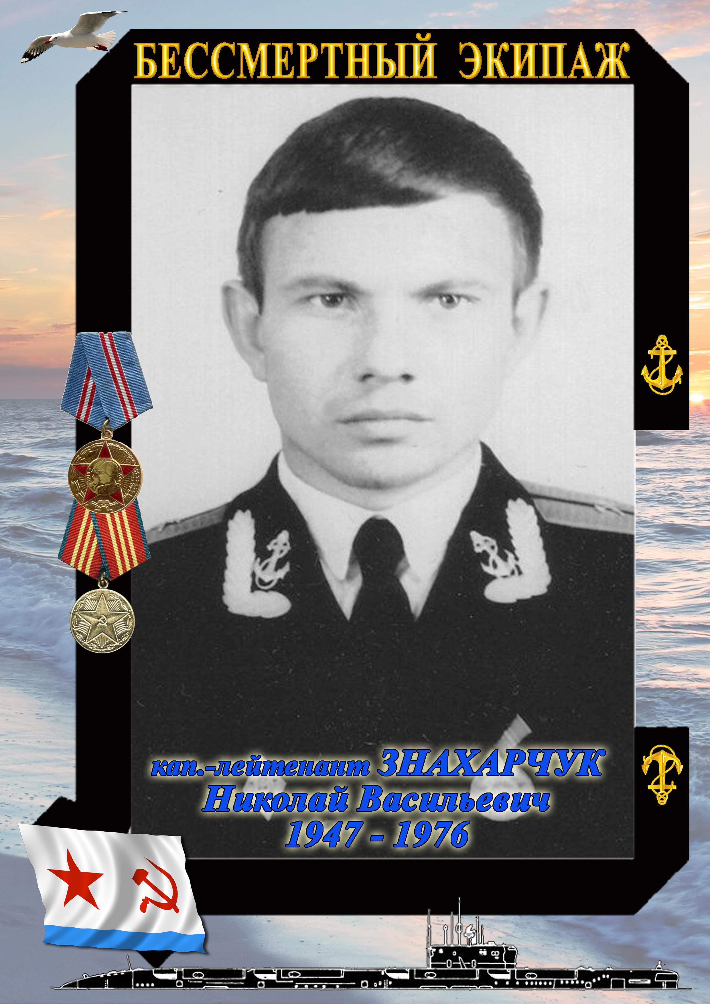 И наш земляк ЗНАХОРЧУК Николай Васильевич - капитан-лейтенант-инженер, командир дивизиона движения БЧ-5, выпускник Севастопольского ВВМИУ 1970 года. Родился в 1947 году в с. Дивин Кобринского района Брестской области, призван на флот 7 августа 1965 года Кобринским РВК.