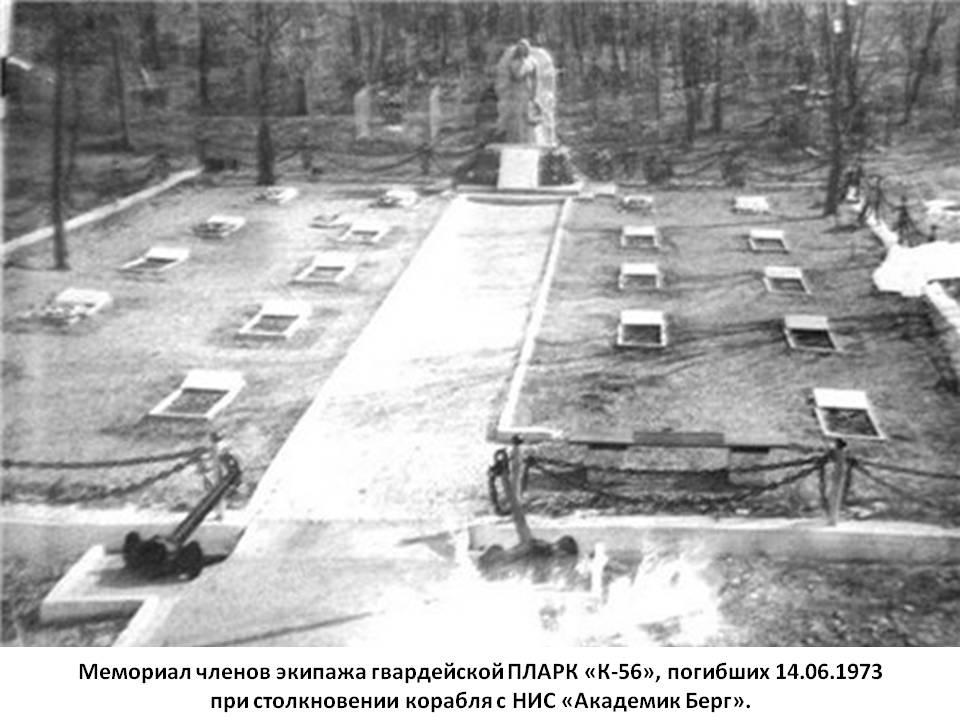 Всего на подводной лодке К-56 погибли 27 человек: 16 офицеров, 5 мичманов, 5 матросов и гражданский специалист. 19 июня 1973 года 19 погибших подводников похоронили на кладбище посёлка Тихоокеанского. На братской могиле установили памятник, созданный на средства, собранные личным составом флота. Самые настойчивые родители и жены смогли добиться вывоза тел своих погибших сыновей и мужей к себе на родину.