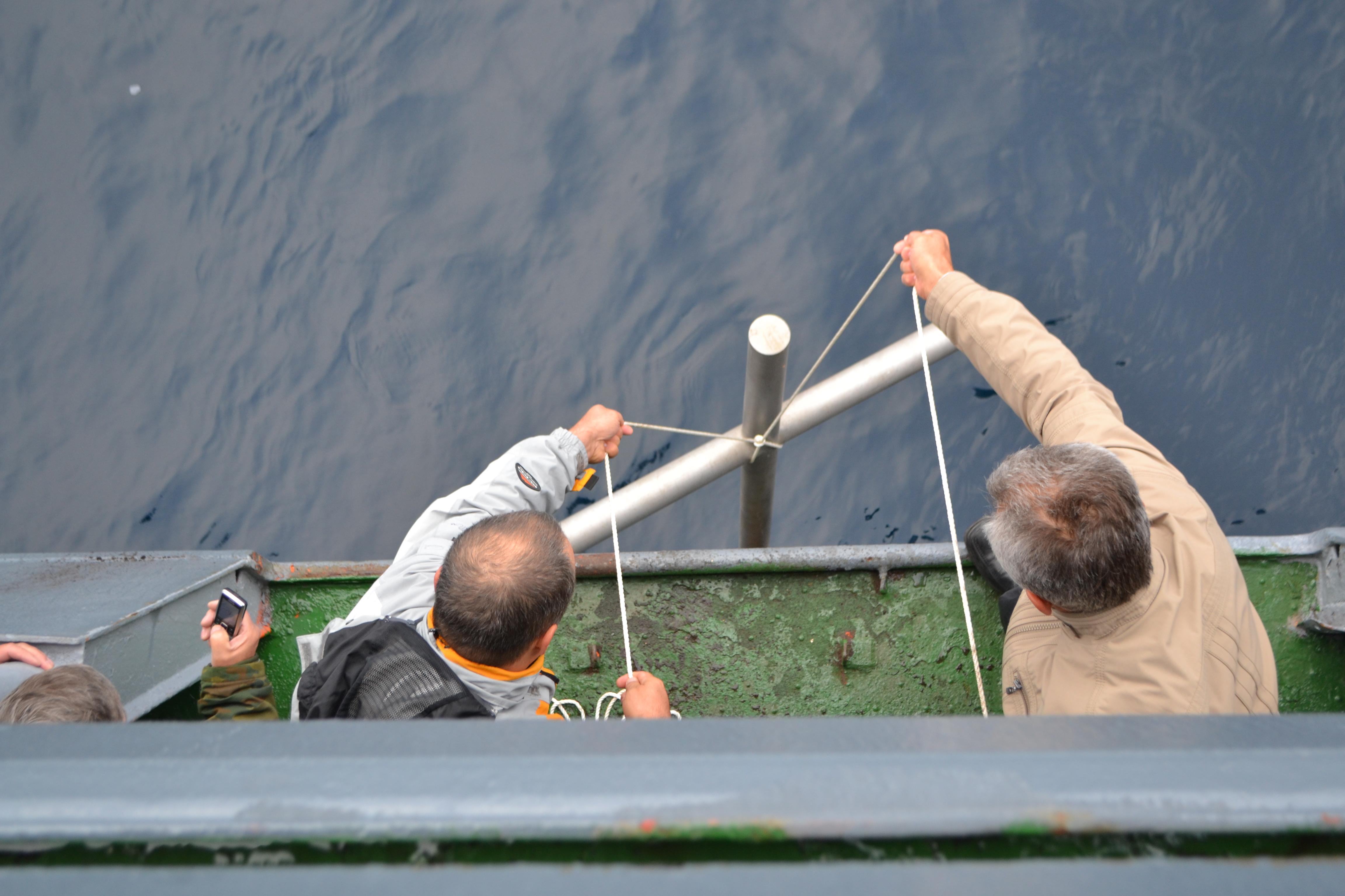 Поднявшись на борт «Василия Косякова» началась подготовка к особому ритуалу - спуска на воду Креста. Капитан корабля определил место погружения. То место, где затапливали баржи с заключёнными Соловецкого лагеря политзаключённых и то место где уходили на дно защитники Севрной земли.