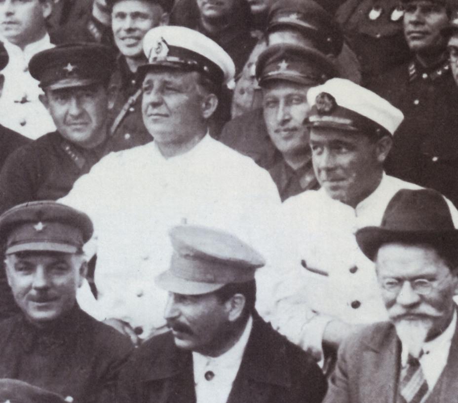 Р. А. Муклевич (в белом кителе, за спиной Сталина) среди делегатов армии и флота на XVI съезде ВКП(б) в 1930 году. Источник: http://tsushima.su