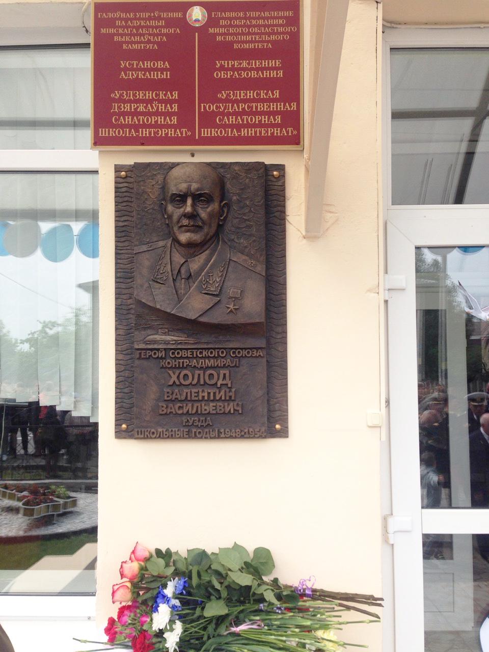 Мемориальная доска на Узденской школе, в которой учился Холод В.В. Открыта "Белорусским союзом военных моряков" 17 мая 2019 года.