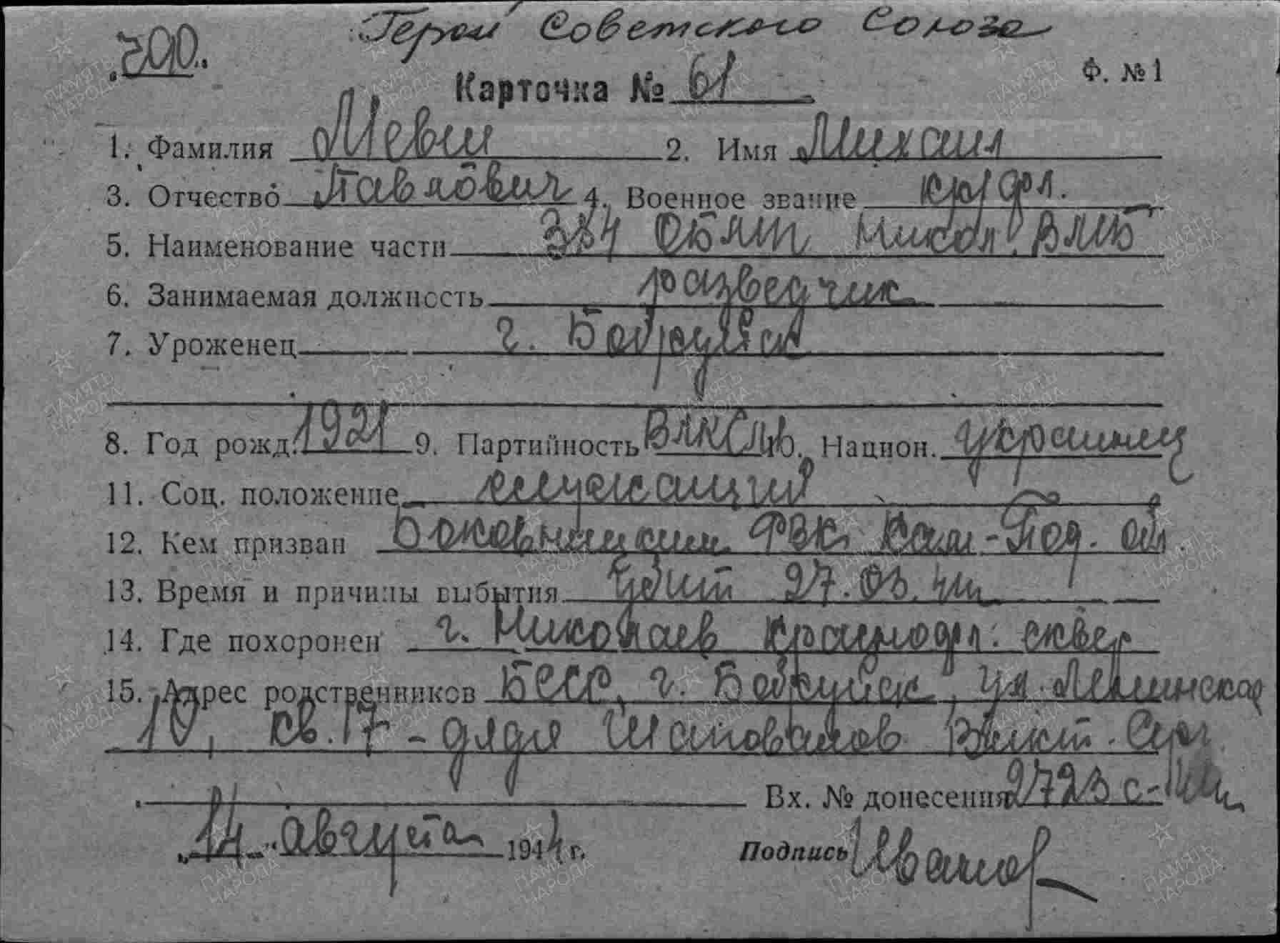 МЕВШ (Мебш) Михаил Павлович – разведчик взвода разведки 384-го отдельного батальона морской пехоты Одесской военно-морской базы Черноморского флота, краснофлотец.