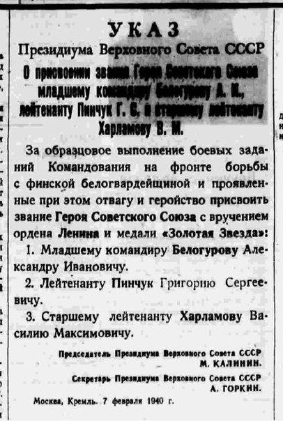 Указом Президиума Верховного Совета СССР от 7 февраля 1940 года за образцовое выполнение заданий командования и проявленные при этом мужество и героизм, лейтенанту Пинчуку Григорию Сергеевичу присвоено звание Героя Советского Союза с вручением ордена Ленина и медали «Золотая Звезда».