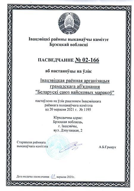Поставить на учет без права юридического лица Ивацевичскую районную организацию общественного объединения «Белорусский союз военных моряков» по юридическому адресу: Брестская область, г. Ивацевичи, ул. Депутатская,2
