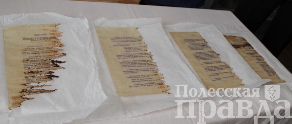 По словам директора Музея Белорусского Полесья И.Г. Демчук, научные сотрудники произвели первоначальный осмотр и выявили, что капсула представляет собой стеклянную колбу, верхний край которой имел скол с трещиной по всей длине. Содержимое колбы от верхнего края до середины состояло из неоднородной серо-коричневой массы. Вторая половина была заполнена веществом бледно-серого цвета однородной структуры, сквозь которое просматривалась бумага с текстом. В Минске, в Белорусском музее истории Великой Отечественной войны, произвели расконсервацию художники-реставраторы В.И. Пчельников, Л.А. Петринец, Е.В. Труханович.