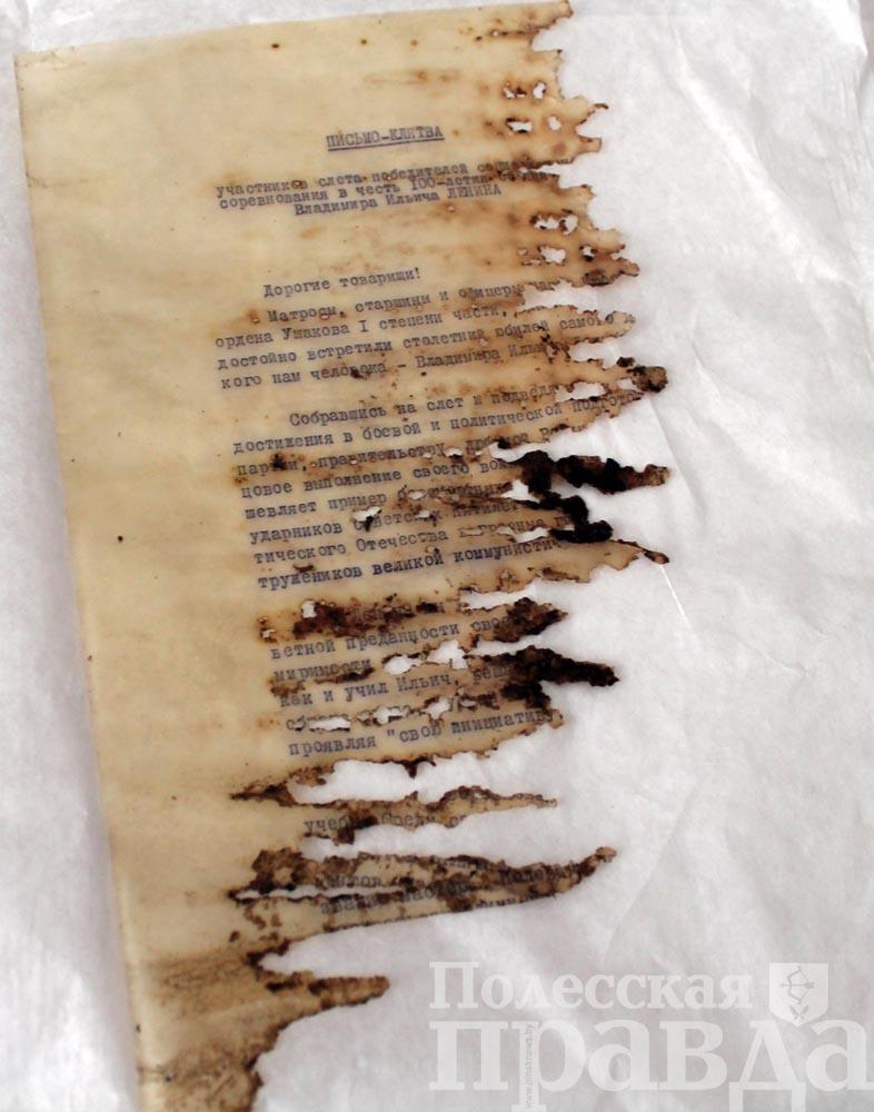 Из отчета реставраторов стало известно, что в результате нагрева колбы был извлечен парафиновый цилиндр. После чего представилась возможность разделить содержащиеся внутри 4 листа формата А 4 с машинописным текстом. Снять весь парафин с листов не удалось. Было установлено, что все листы по правому краю полностью разрушены, а левая их часть сохранилась. Благодаря уцелевшей части присутствовавшие на мероприятии имели возможность частично прочитать письмо-обращение. Общий смысл текста такой: матросы, старшины и офицеры, празднующие со всей страной 100-летний юбилей В.И. Ленина, рапортовали о своих успехах, клялись в верности Родине и завещали потомкам хранить и продолжать их достойные дела.