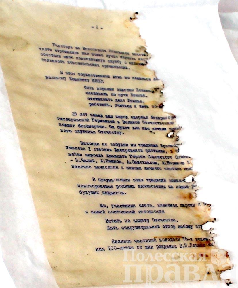 18 октября в Музее Белорусского Полесья состоялось знаменательное событие. Сюда после расконсервации была доставлены капсула с письмом-обращением комсомольцев-моряков к молодежи 2017 года.