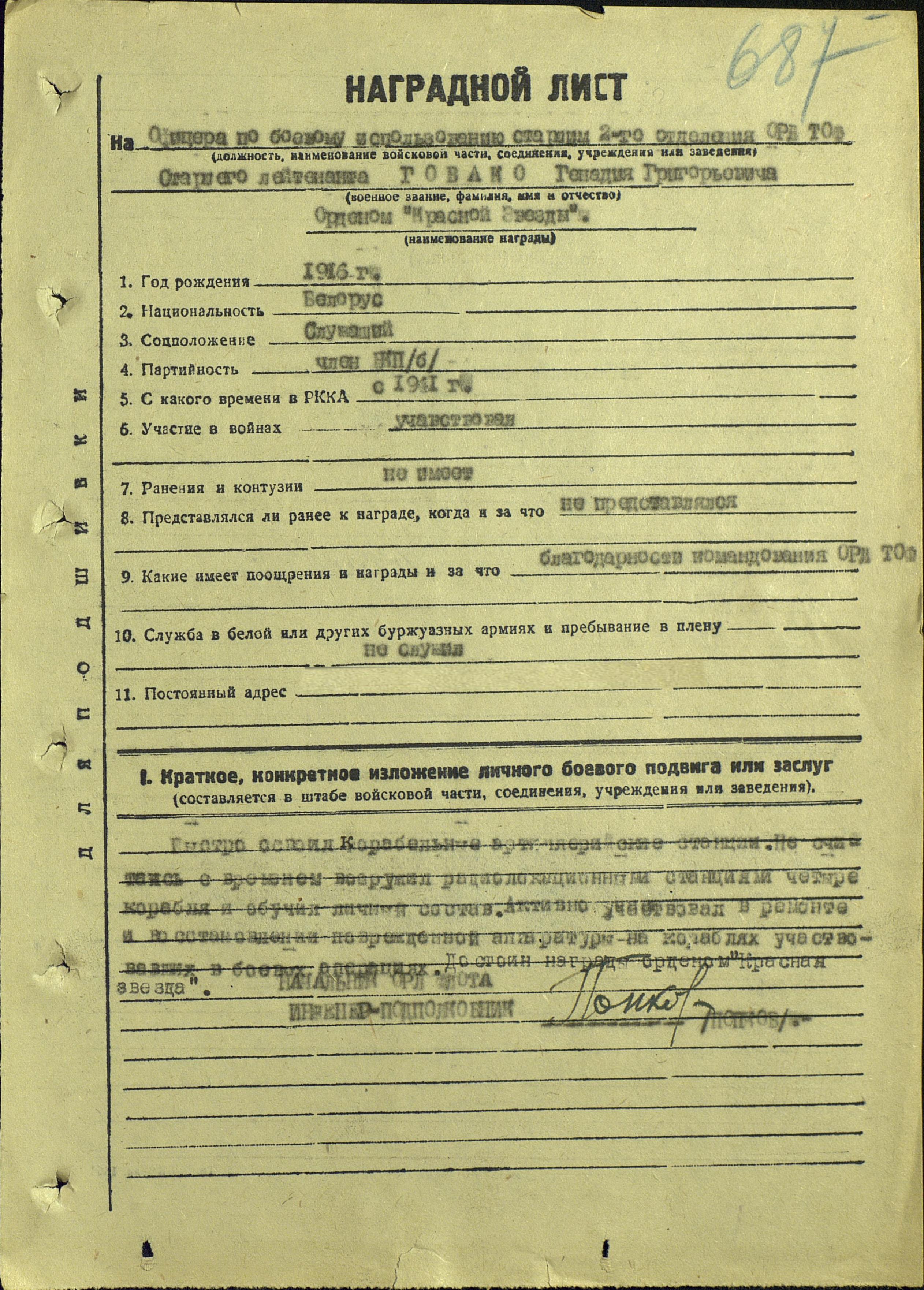 В ноябре 1944 - старший офицер второго отделения спецприборов ТОФ.