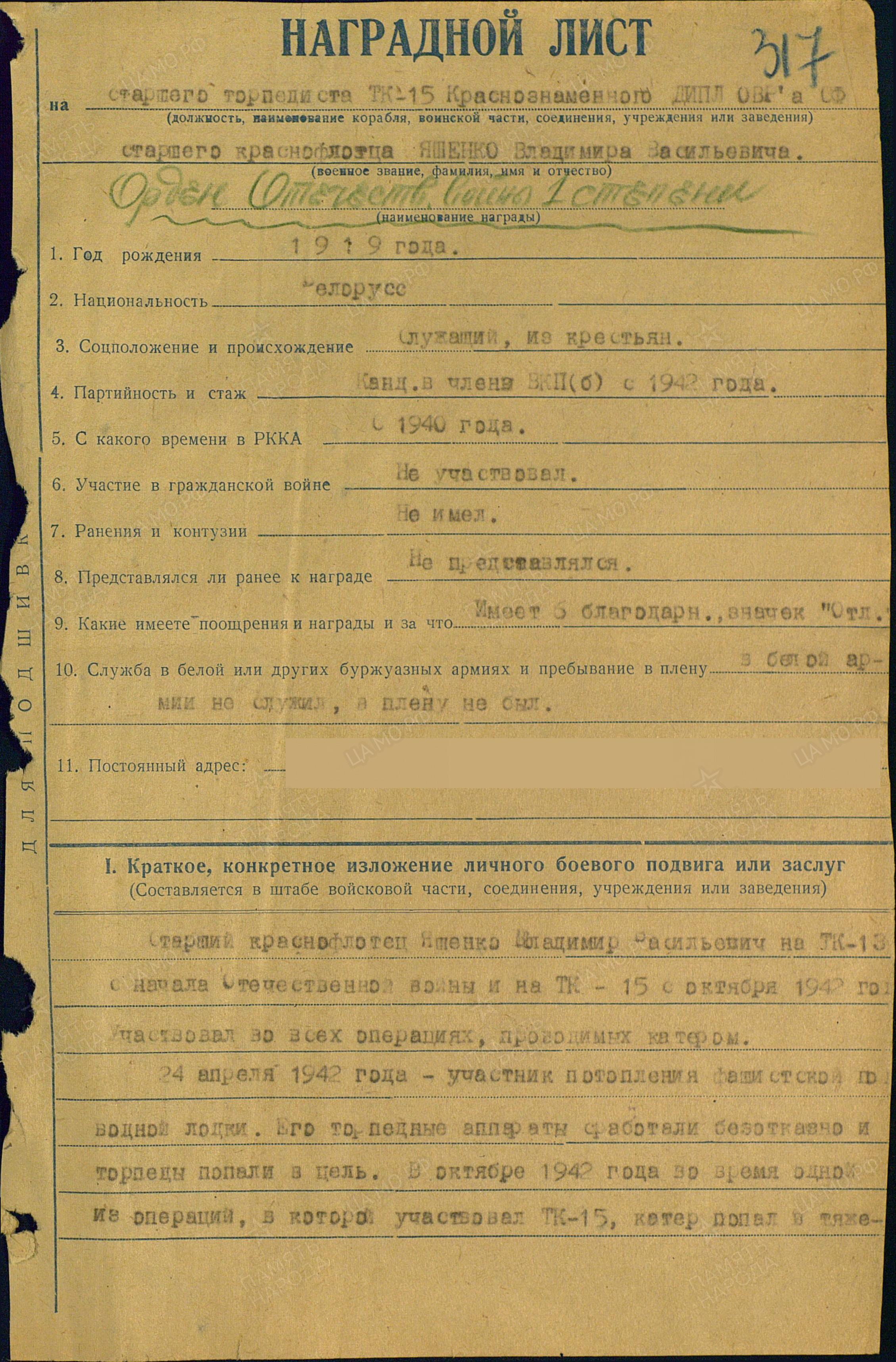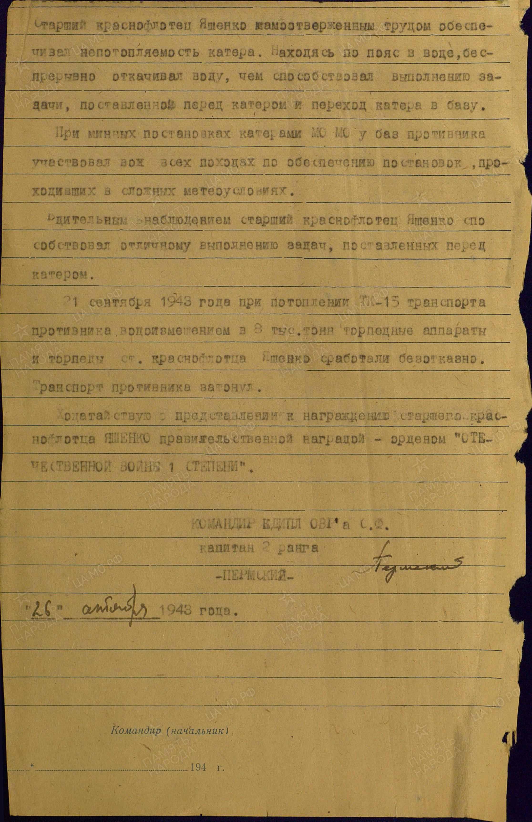 В приказе о награждении орденом Красного Знамени торпедиста отделения Владимира Яшенко находим следующую информацию. «В операции в ночь с 22 на 23 декабря при сильном противодействии со стороны противника под пулемётным и артиллерийским огнём чётко и быстро выполнял все приказы командира.
