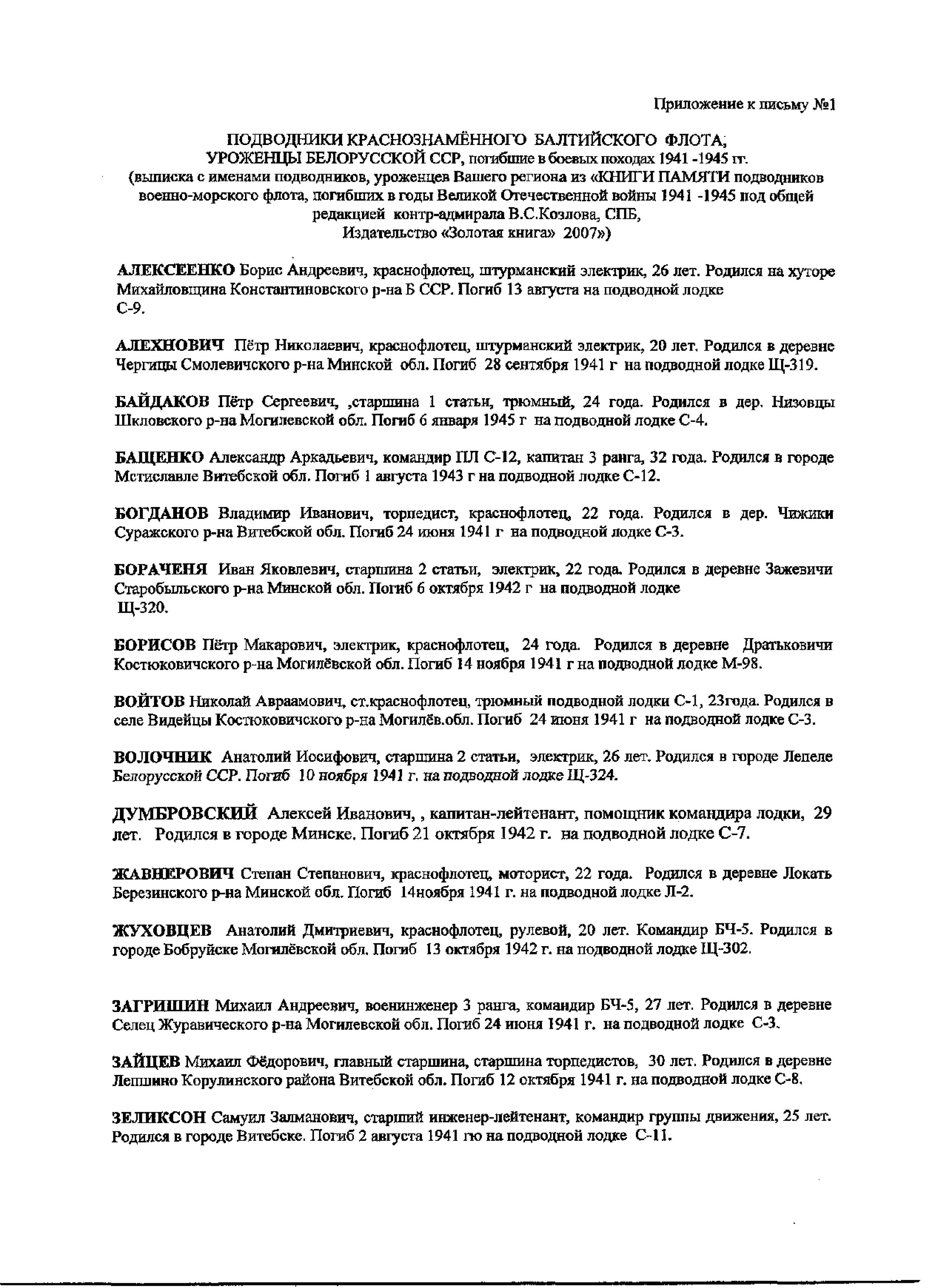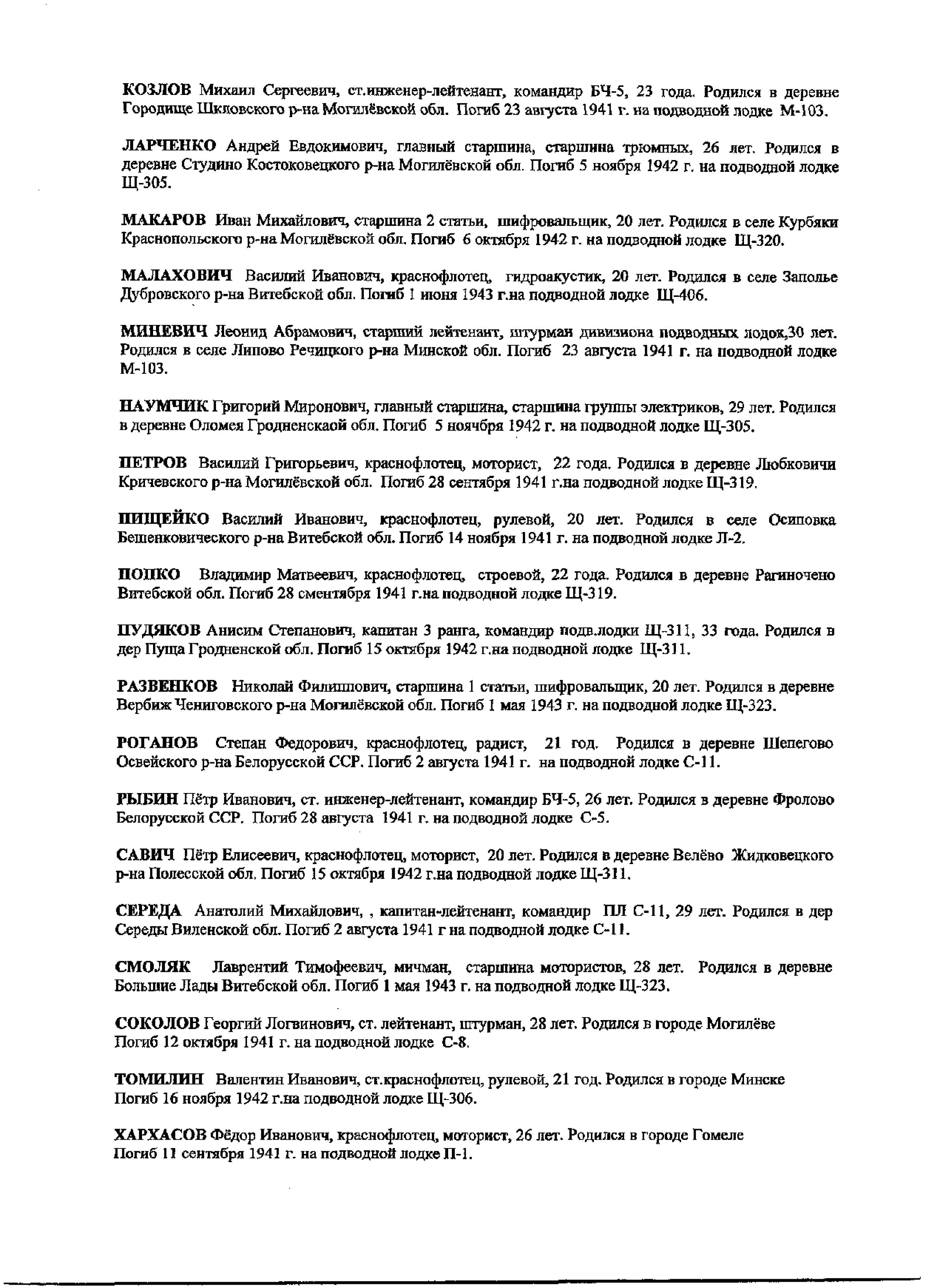 ПОДВОДНИКИ КРАСНОЗНАМЁННОГО БАЛТИЙСКОГО ФЛОТА, УРОЖЕНЦЫ БЕЛОРУССКОЙ ССР, погибшие в боевых походах 1941 -1945.
