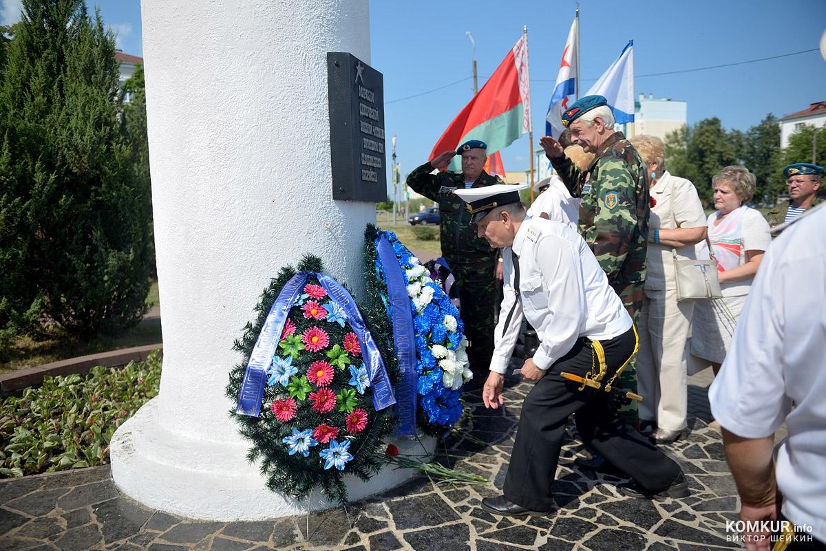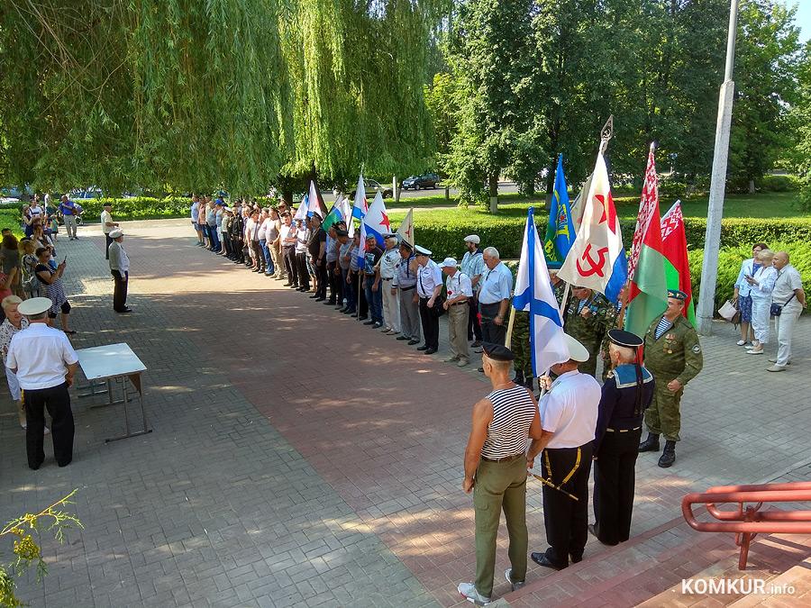 Построение, вынос флага Военно-морского флота, и в половине 11-го личный состав ОО «Белорусский Союз военных моряков» направился на автобусе к Мемориальному памятному знаку в честь моряков Днепровской военной флотилии, принимавших участие и погибших при освобождении Бобруйска.