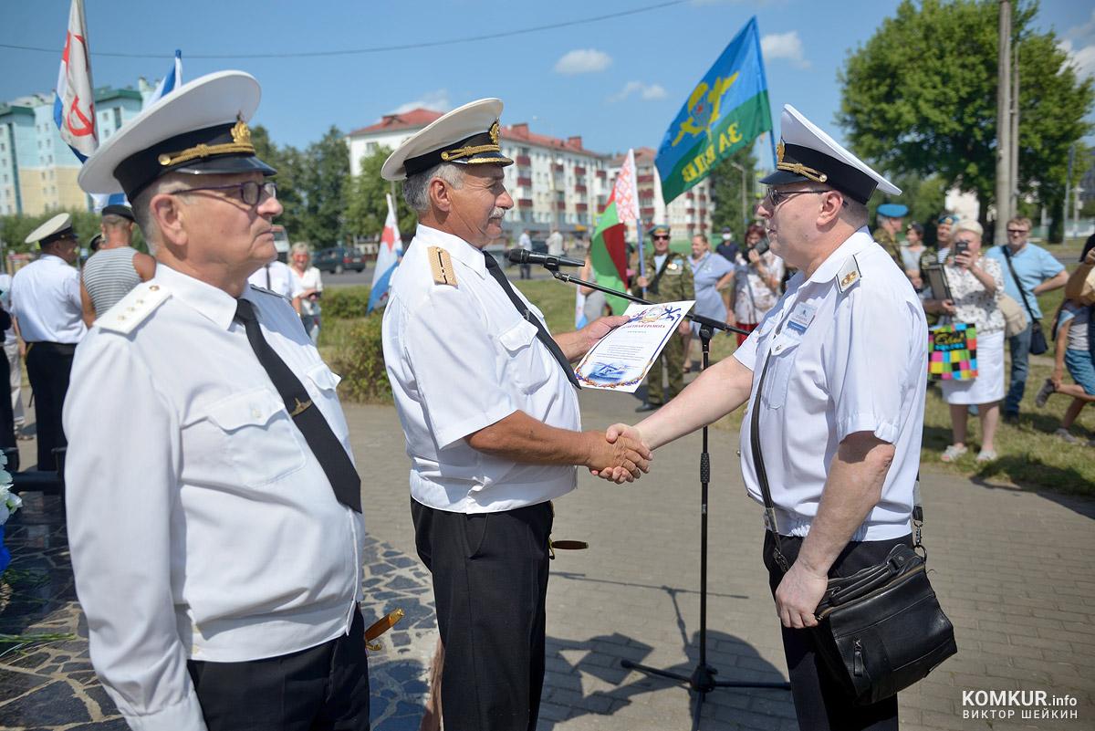 Возложение венков и цветов. Митинг. И награждение Почетными грамотами «За активное участие и оказание помощи в работе ОО «Белорусский Союз военных моряков» по обеспечению связи поколений и воспитанию патриотизма у подрастающего поколения, сохранении традиций военных моряков и ветеранов». Вот имена награжденных: капитан-лейтенант Александр Александрович Лепестов; матрос Анатолий Николаевич Шушеначев; матрос Сергей Юрьевич Попов; старший мичман Владимир Юрьевич Майданик; старший мичман Иван Николаевич Алесь; мичман Виктор Васильевич Немцов; матрос Александр Александрович Никитко. Медаль «325 лет флоту» получил председатель городской организации ОО «Белорусский союз военных моряков» Сергей Евгеньевич Стрельцов.