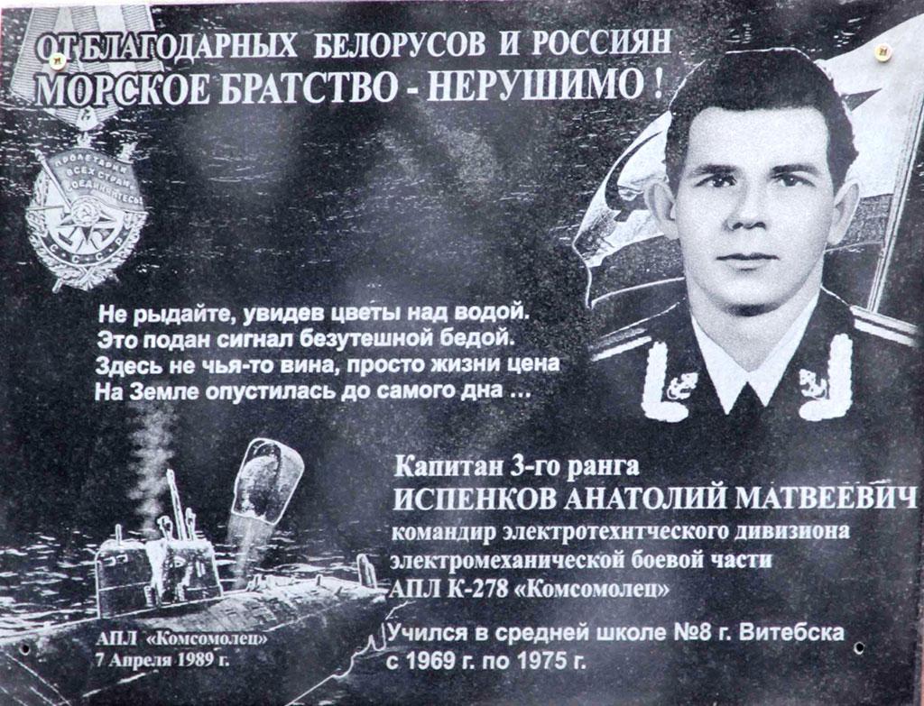 Среди погибших были и наши земляки: уроженец Шумилинского района Витебской области, капитан 3 ранга Анатолий Матвеевич Испенков; командир электротехнического дивизиона БЧ 5, уроженец города Лиды, командир группы дистанционного управления, капитан-лейтенант Сергей Нежутин; уроженец поселка Победоносный Клецкого района Минской области, командир отделения рулевых-сигнальщиков, старший матрос Игорь Олегович Апаносевич и уроженец Мяделя Минской области, электрик АПЛ, старший матрос Евгений Эдмунтович Вершило.