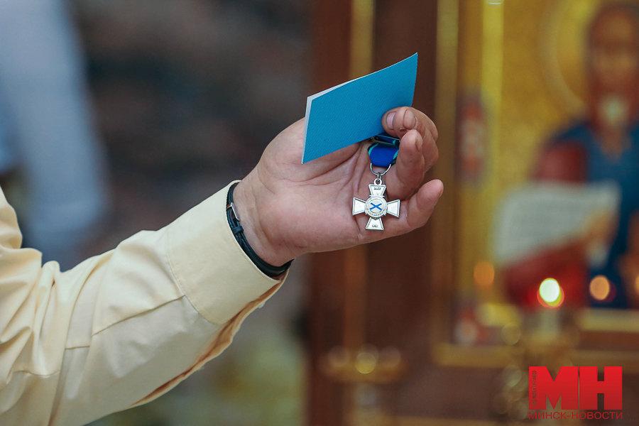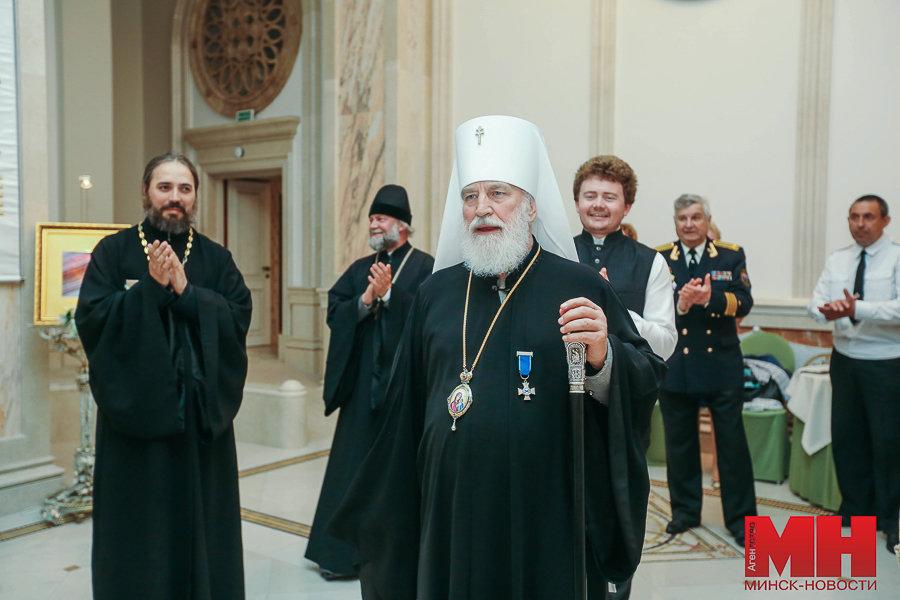 За великий труд по служению своей Родине и народу Валерий Холодилин под аплодисменты присутствующих вручил Митрополиту Минскому и Заславскому Павлу памятный знак объединения «300 лет Андреевскому флагу».