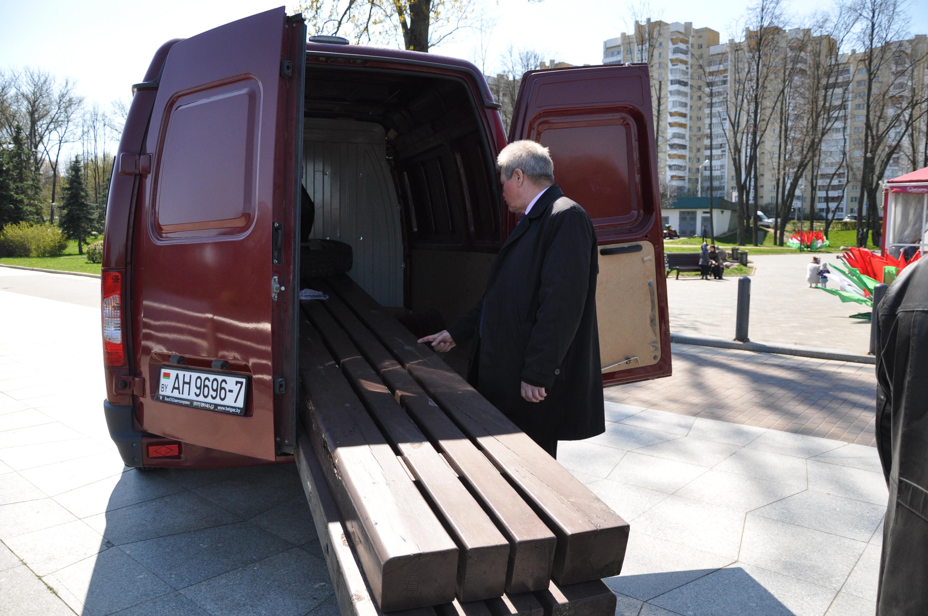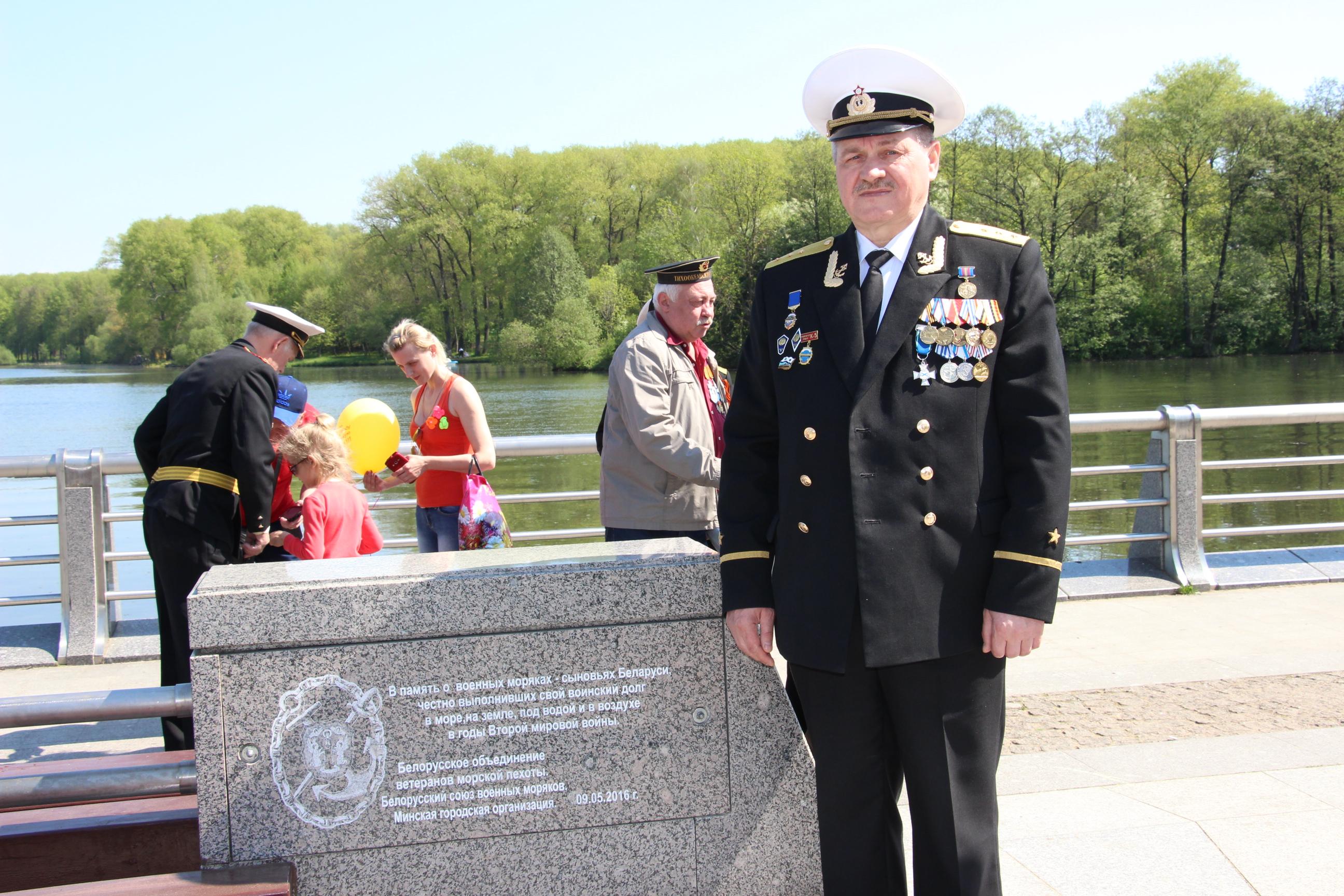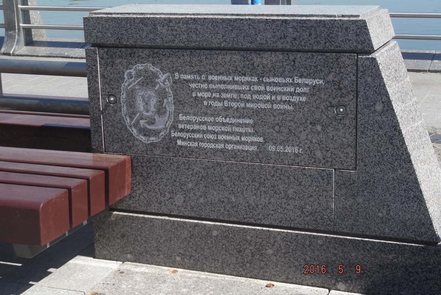 На набережной Комсомольского озера, со стороны проспекта Победителей, появилась необычная скамейка. На её гранитной панели выгравировано посвящение военным морякам: «В память о военных моряках – сыновьях Беларуси, честно выполнившим свой воинский долг в море, на земле, под водой и в воздухе в годы Второй мировой войны.»