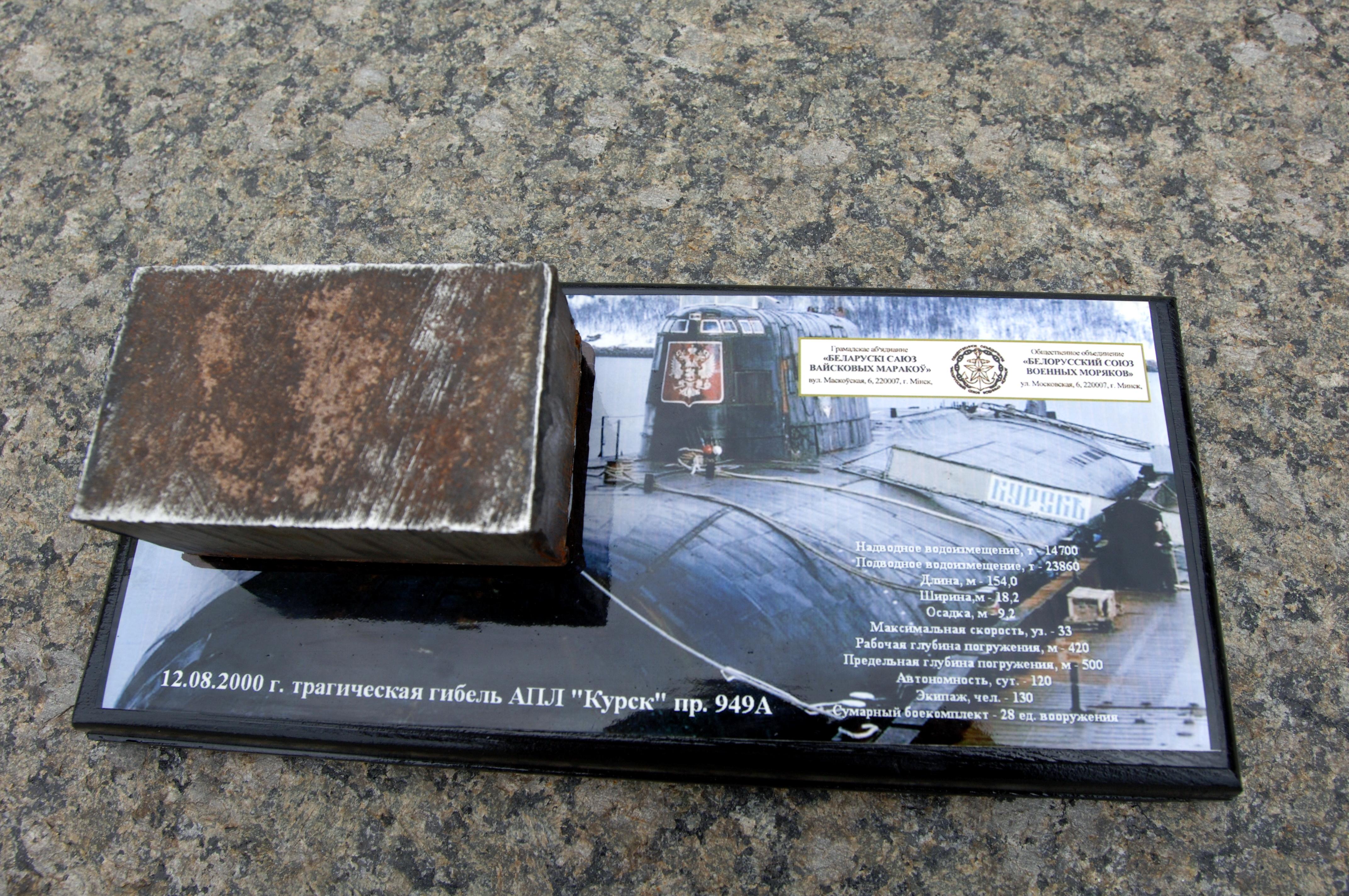Фрагмент АПРК "Курск" доставлен с Северного флота в 2002 году по инициативе председателя ОО «Белорусский союз военных моряков» капитана 1-го ранга Владимира Ворошнина. В марте этого года союз передал фрагмент прочного корпуса Музею истории Великой Отечественной войны, второй - с сегодняшнего дня будет находиться в Храме-памятнике в честь Всех Святых.